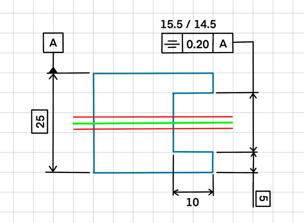 Similar to concentricity, the theoretical median plane of the slot must lie within 0.2mm tolerance zone stated, the width of the slot is treated separately. Also shown, the depth of the slot has no influence of the symmetry, therefore the depth is not shown as a TED.