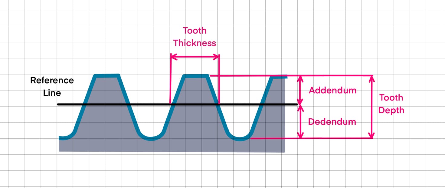 - Dedendum: Depth of the tooth between the pitch circle and the minor diameter.